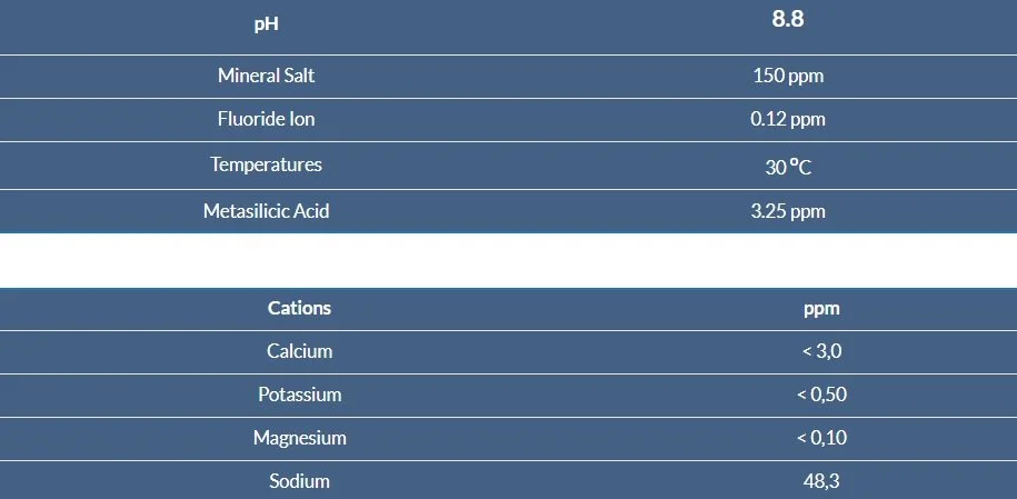 Belongs to the group of High-Alkaline (pH 8,8), Low-Mineralized, and Bicarbonate waters.